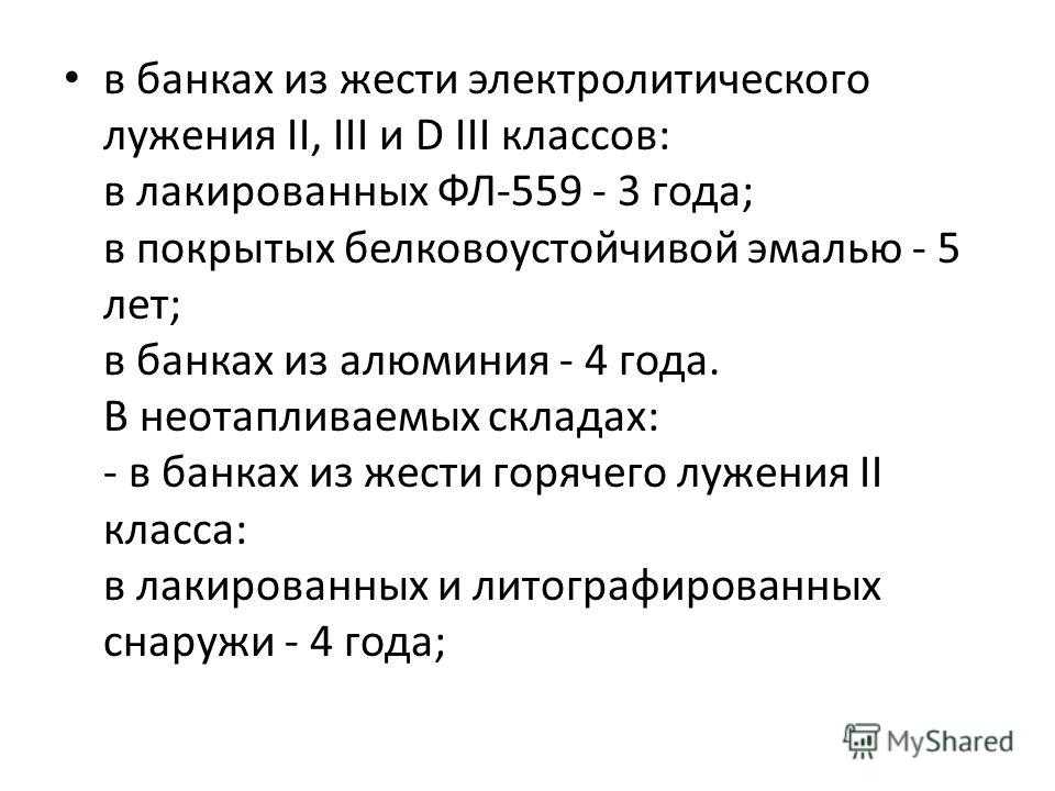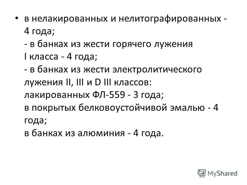 в нелакированных и нелитографированных — 4 года; — в банках из жести горячего лужения I класса — 4 года; — в банках из жести электролитического лужения II, III и D III классов: лакированных ФЛ года; в покрытых белковоустойчивой эмалью — 4 года; в банках из алюминия — 4 года.