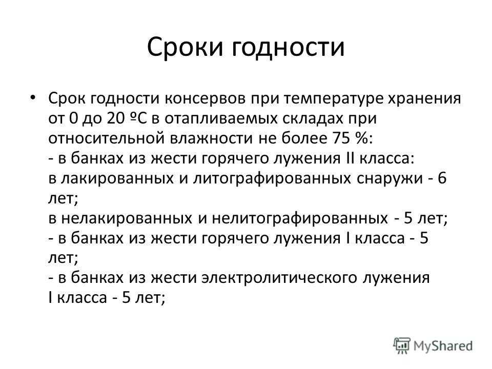 Сроки годности Срок годности консервов при температуре хранения от 0 до 20 ºС в отапливаемых складах при относительной влажности не более 75 %: — в банках из жести горячего лужения II класса: в лакированных и литографированных снаружи — 6 лет; в нелакированных и нелитографированных — 5 лет; — в банках из жести горячего лужения I класса — 5 лет; — в банках из жести электролитического лужения I класса — 5 лет;