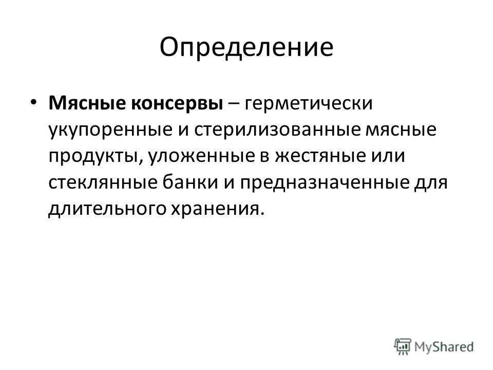 Определение Мясные консервы – герметически укупоренные и стерилизованные мясные продукты, уложенные в жестяные или стеклянные банки и предназначенные для длительного хранения.