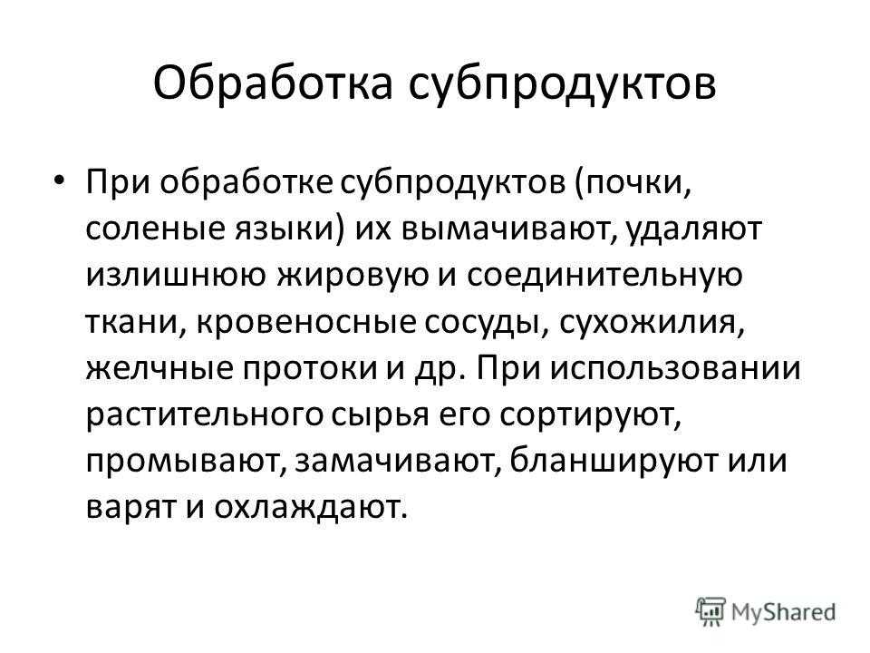 Обработка субпродуктов При обработке субпродуктов (почки, соленые языки) их вымачивают, удаляют излишнюю жировую и соединительную ткани, кровеносные сосуды, сухожилия, желчные протоки и др. При использовании растительного сырья его сортируют, промывают, замачивают, бланшируют или варят и охлаждают.