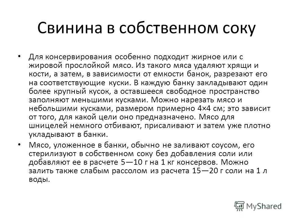 Свинина в собственном соку Для консервирования особенно подходит жирное или с жировой прослойкой мясо. Из такого мяса удаляют хрящи и кости, а затем, в зависимости от емкости банок, разрезают его на соответствующие куски. В каждую банку закладывают один более крупный кусок, а оставшееся свободное пространство заполняют меньшими кусками. Можно нарезать мясо и небольшими кусками, размером примерно 4×4 см; это зависит от того, для какой цели оно предназначено. Мясо для шницелей немного отбивают, присаливают и затем уже плотно укладывают в банки. Мясо, уложенное в банки, обычно не заливают соусом, его стерилизуют в собственном соку без добавления соли или добавляют ее в расчете 510 г на 1 кг консервов. Можно залить также слабым рассолом из расчета 1520 г соли на 1 л воды.