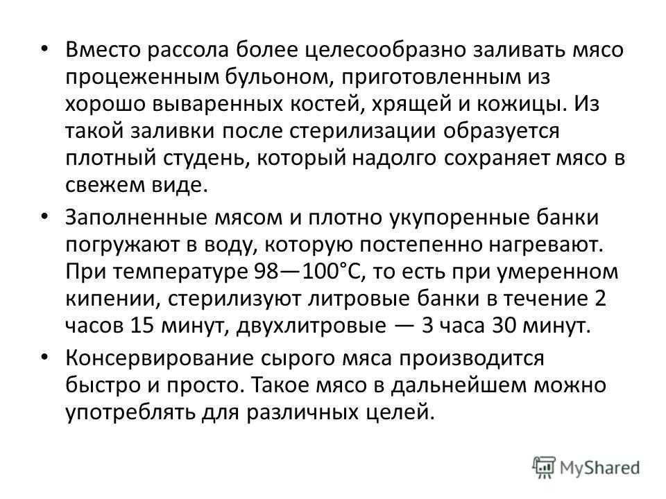Вместо рассола более целесообразно заливать мясо процеженным бульоном, приготовленным из хорошо вываренных костей, хрящей и кожицы. Из такой заливки после стерилизации образуется плотный студень, который надолго сохраняет мясо в свежем виде. Заполненные мясом и плотно укупоренные банки погружают в воду, которую постепенно нагревают. При температуре 98100°С, то есть при умеренном кипении, стерилизуют литровые банки в течение 2 часов 15 минут, двухлитровые 3 часа 30 минут. Консервирование сырого мяса производится быстро и просто. Такое мясо в дальнейшем можно употреблять для различных целей.