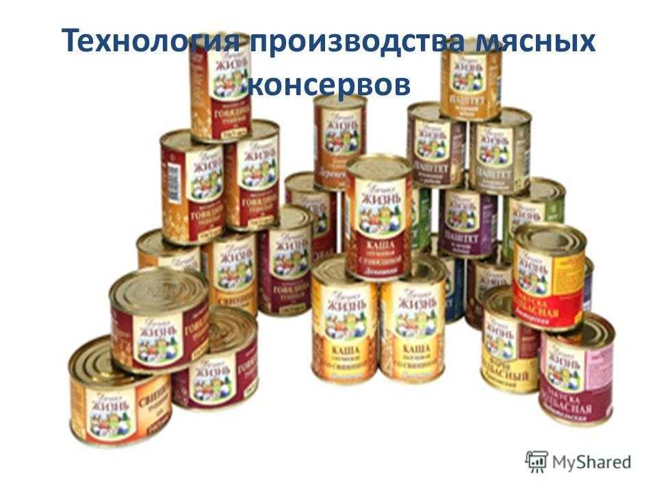 По технологии приготовления мясоконсервы бывают тушеные (тушенка), закусочные (вареные и тушеные с овощами, крупами, соусами и специями), диетические (вареные, с желейной заливкой), детские (паштетообразные пастеризованные пюре).