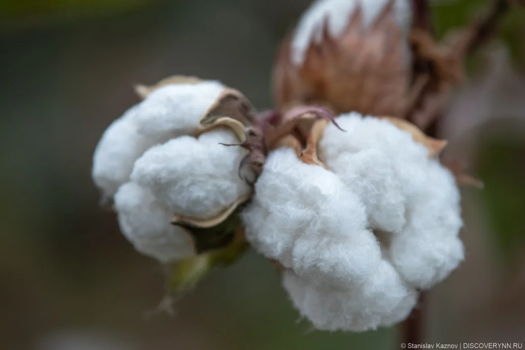 Зрелая семенная коробочка трескается и раскрывается. Чтобы хлопок созрел, за месяц до окончания вегетации на поле перестают подавать воду для полива. Белоснежные хлопковые шарики на сухих ветках смотрятся завораживающе.