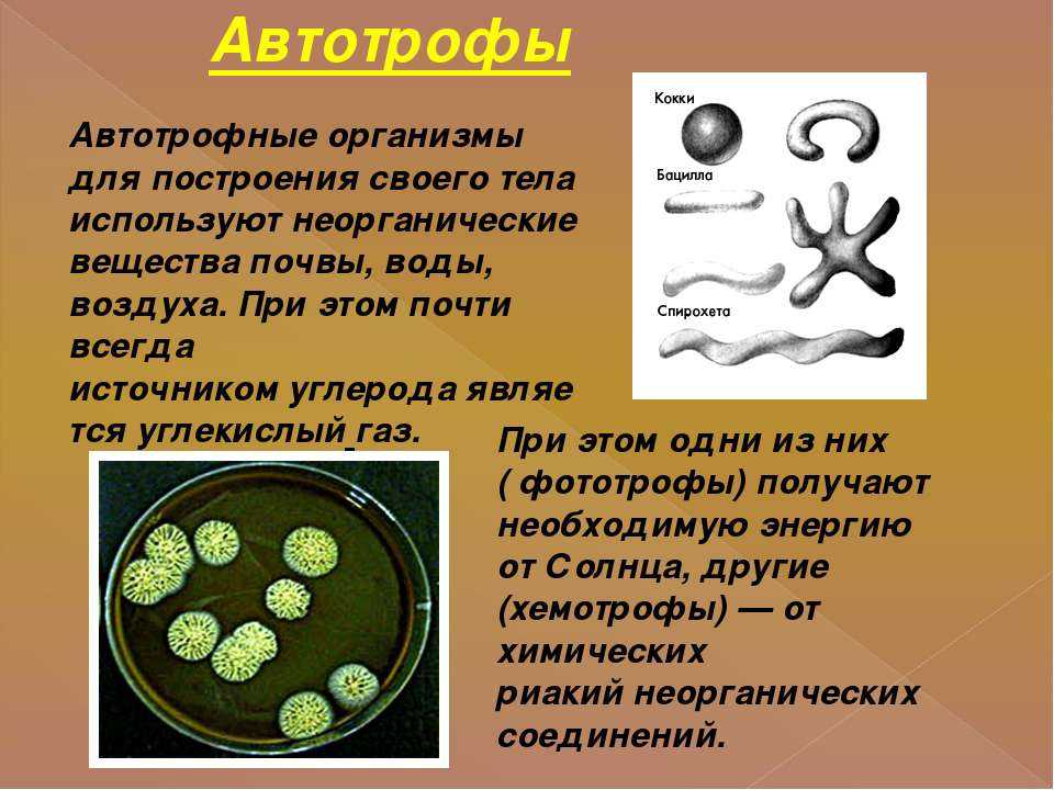Таким образом, источником энергии для них является солнечный свет или эффект химических реакций. По такому признаку все автотрофы делятся на фототрофов и хемотрофов.