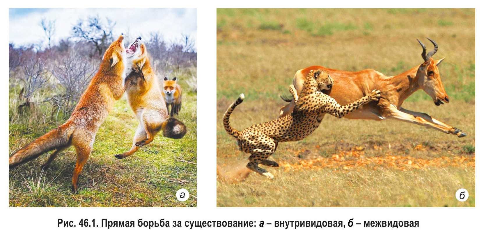 Прямая борьба сопровождается более или менее выраженным физическим контактом особей. Она может происходить между особями одного или разных видов (рис. 46.1). Так, проявлениями прямой внутривидовой борьбы являются схватка волков за добычу, сражение самцов за самку в брачный период, выкармливание детенышей и т. д. Примерами прямой межвидовой борьбы могут служить: выбрасывание птенцом кукушки других птенцов из гнезда приемных родителей, взаимоотношения между паразитами и их хозяевами, хищниками и жертвами, растениями и животными, которые их опыляют или распространяют плоды и семена.