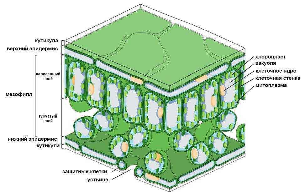 Ниже представлена близкая схема внутреннего строения тканей листьев: