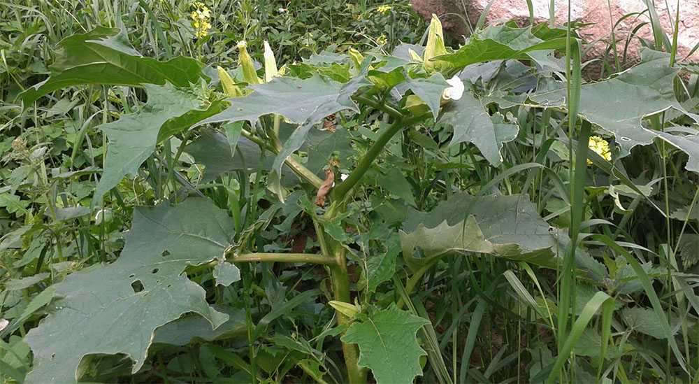 Дурман обыкновенный выглядит высоким растением и состоит из толстого стебля и листьев в форме зубцов.