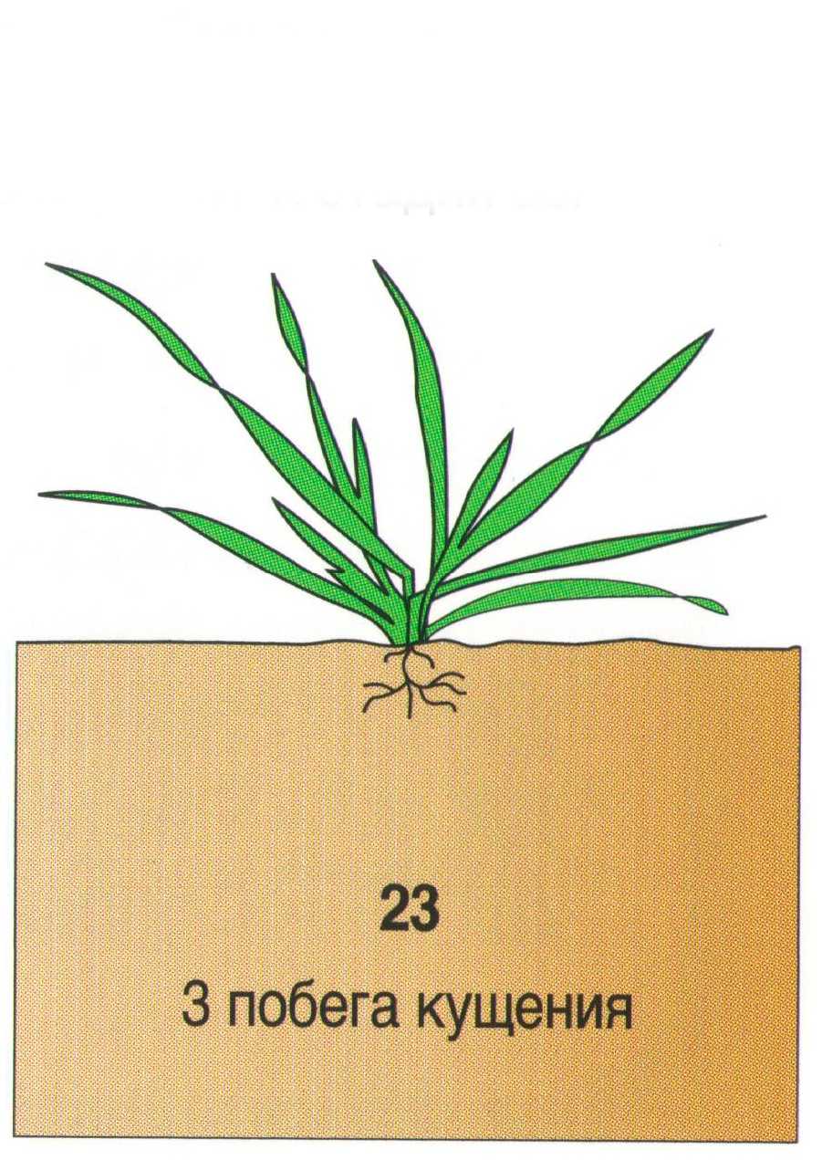 Начало стеблевания: верхушечный побег и побег кущения, как следует распрямившись, начинают удлиняться. Колос находится на расстоянии не меньше 1 см от узла кущения.31