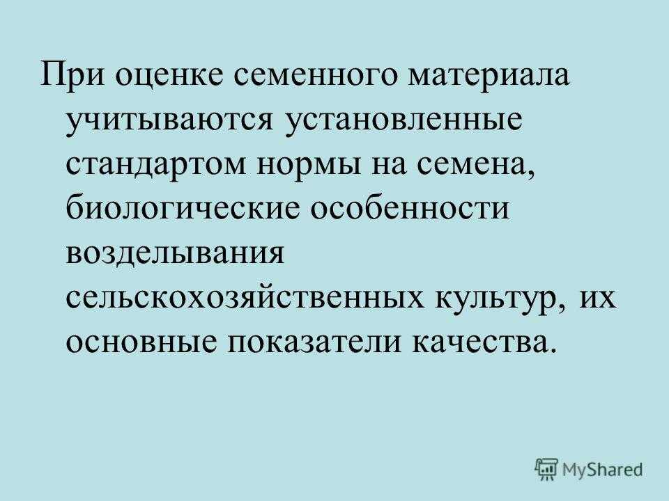 При оценке семенного материала учитываются установленные стандартом нормы на семена, биологические особенности возделывания сельскохозяйственных культур, их основные показатели качества.