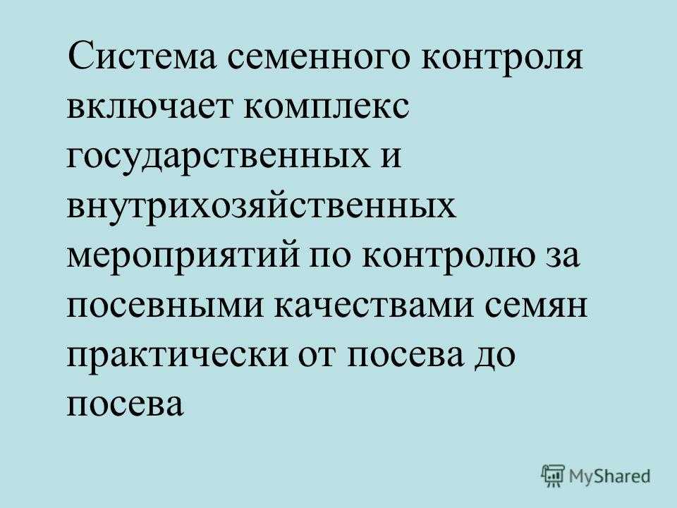 Система семенного контроля включает комплекс государственных и внутрихозяйственных мероприятий по контролю за посевными качествами семян практически от посева до посева