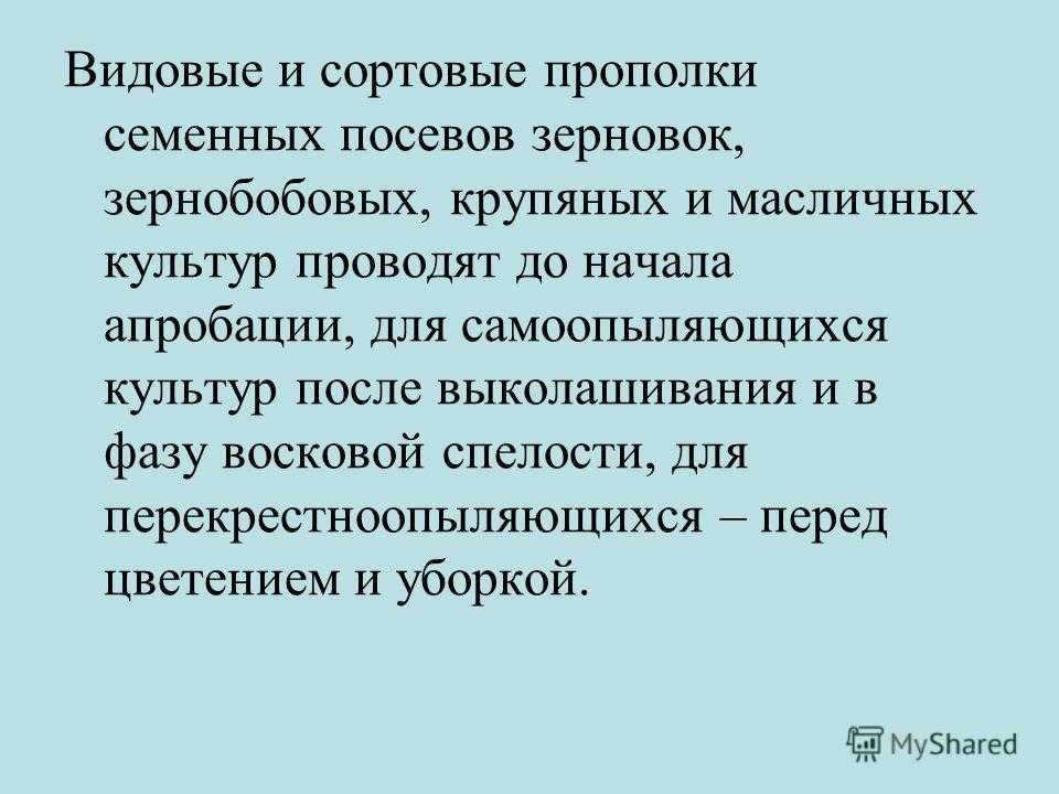 Видовые и сортовые прополки семенных посевов зерновок, зернобобовых, крупяных и масличных культур проводят до начала апробации, для самоопыляющихся культур после выколашивания и в фазу восковой спелости, для перекрестноопыляющихся – перед цветением и уборкой.