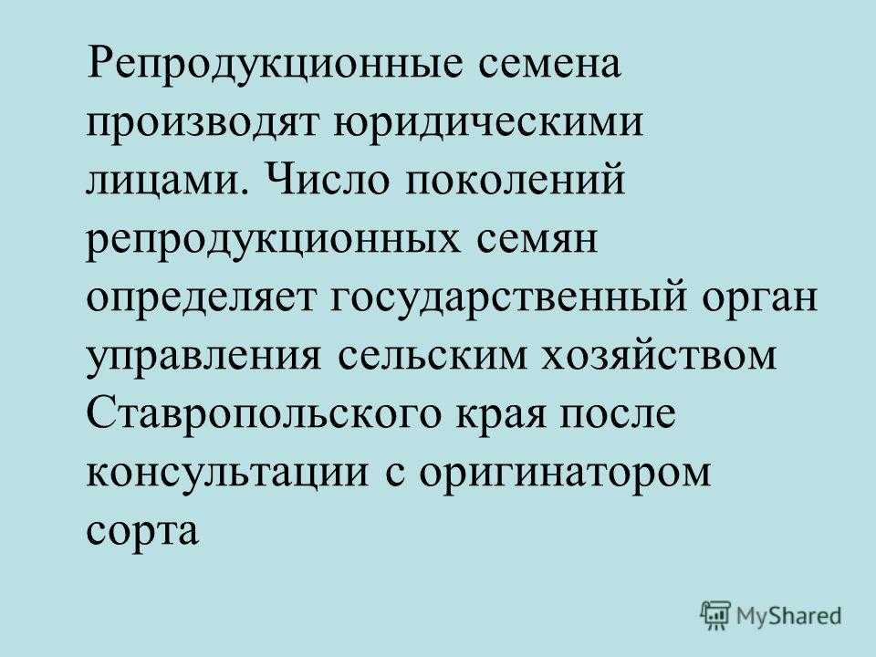 Репродукционные семена производят юридическими лицами. Число поколений репродукционных семян определяет государственный орган управления сельским хозяйством Ставропольского края после консультации с оригинатором сорта