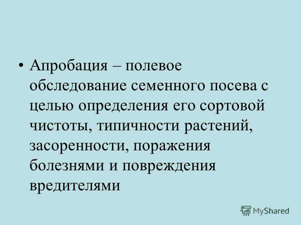 Апробация – полевое обследование семенного посева с целью определения его сортовой чистоты, типичности растений, засоренности, поражения болезнями и повреждения вредителями