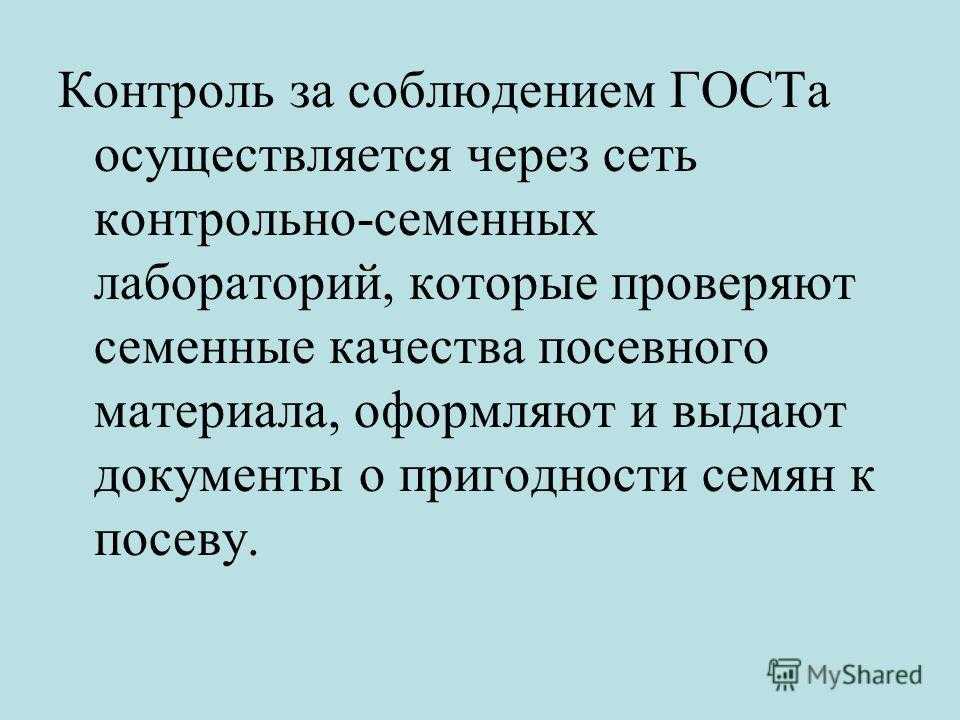 Контроль за соблюдением ГОСТа осуществляется через сеть контрольно-семенных лабораторий, которые проверяют семенные качества посевного материала, оформляют и выдают документы о пригодности семян к посеву.