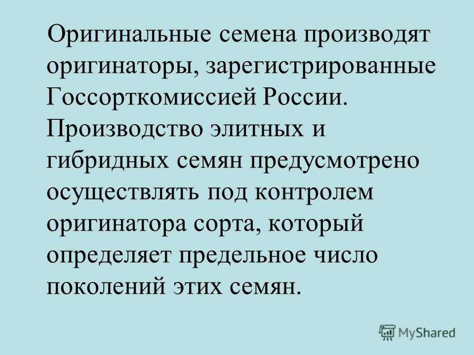 Оригинальные семена производят оригинаторы, зарегистрированные Госсорткомиссией России. Производство элитных и гибридных семян предусмотрено осуществлять под контролем оригинатора сорта, который определяет предельное число поколений этих семян.
