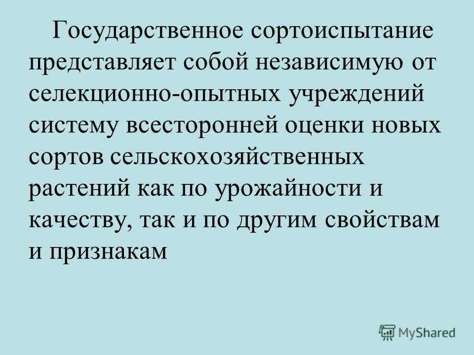 Государственное сортоиспытание представляет собой независимую от селекционно-опытных учреждений систему всесторонней оценки новых сортов сельскохозяйственных растений как по урожайности и качеству, так и по другим свойствам и признакам