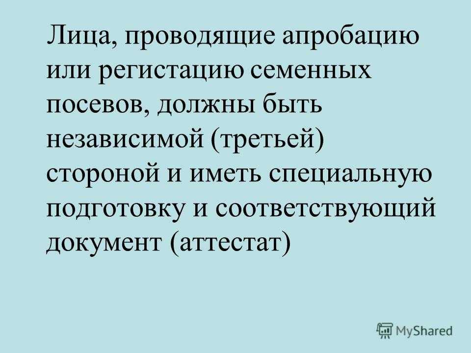 Лица, проводящие апробацию или регистацию семенных посевов, должны быть независимой (третьей) стороной и иметь специальную подготовку и соответствующий документ (аттестат)