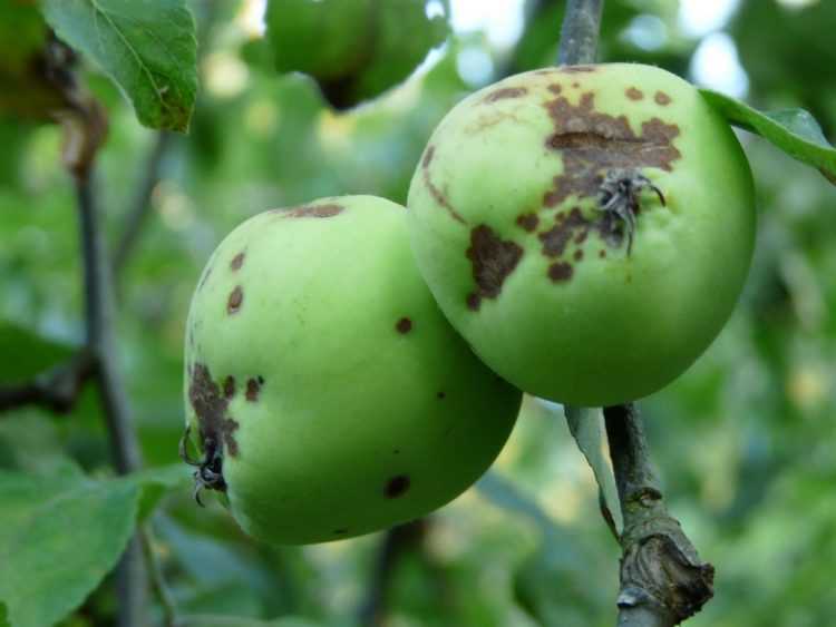 Поражается листва и яблоки. Весной бывают видны первые симптомы: листья становятся зеленовато-бурыми, они быстро засыхают. На яблоках появляются маленькие буроватые пятна.