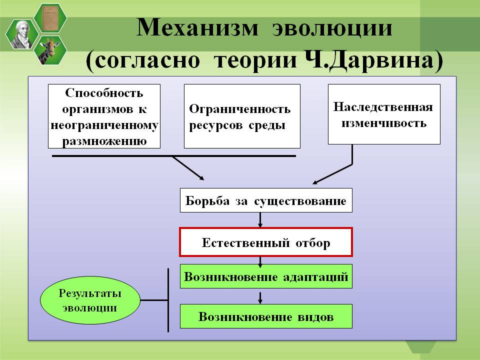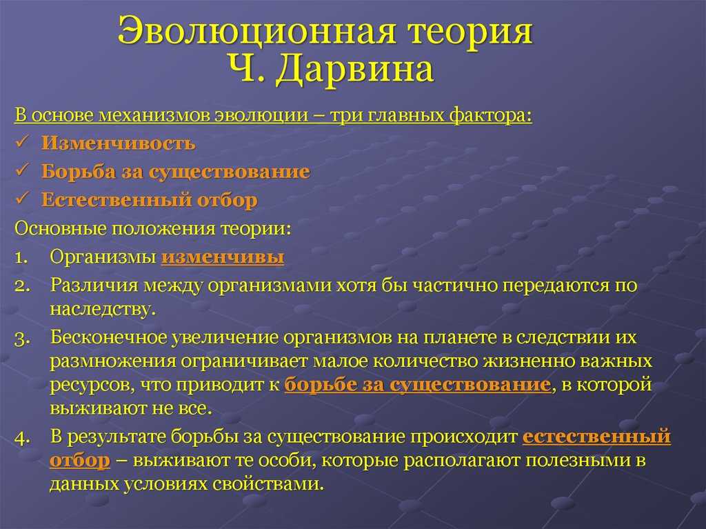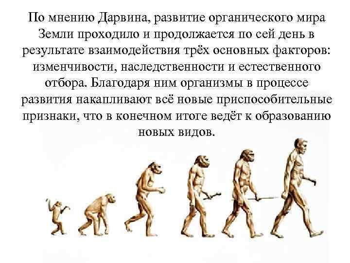 Согласно теории Дарвина, эволюционное развитие на планете возможно под влиянием нескольких важных факторов: