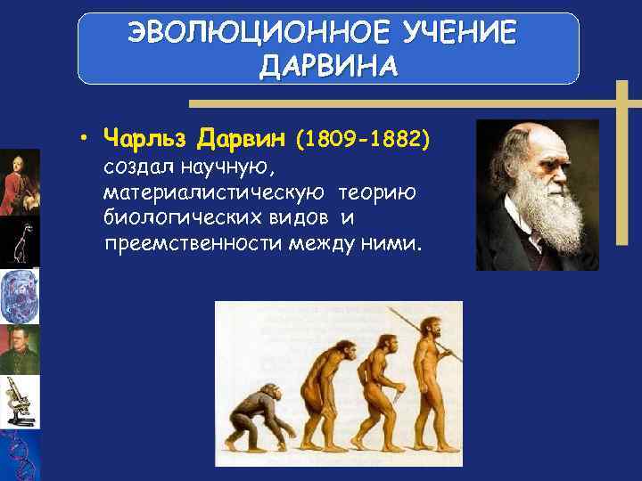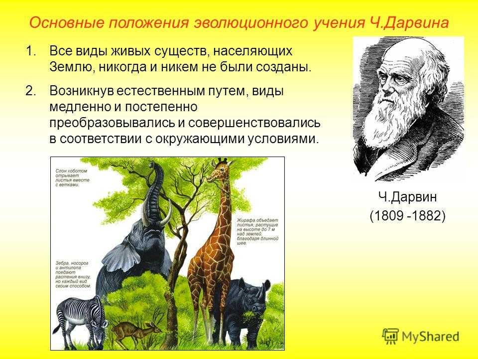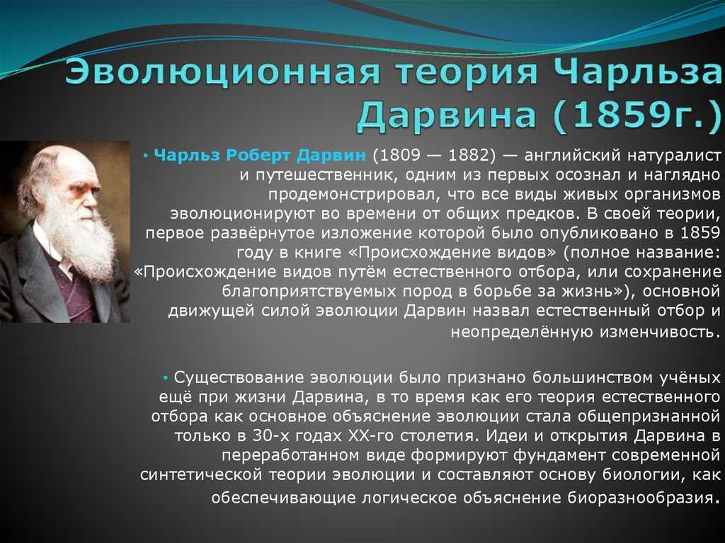 Вряд ли кто-либо из учёных оказал большее влияние на историю биологии, чем Ч. Дарвин (1809—1882). В 1831—1836 гг. молодой Дарвин в качестве натуралиста принял участие в кругосветном путешествии на исследовательском судне «Бигль». Богатый материал, собранный им во время путешествия, знакомство с традицией трансформизма (в изложении его деда Э. Дарвина), склонность к методическим размышлениям привели Дарвина к эволюционным идеям. В 1859 г. Дарвин представил на заседании научного общества свой доклад и статью английского натуралиста А. Р. Уоллеса, в которой тот, независимо от Дарвина, сформулировал подобные выводы. В том же году была опубликована наиболее известная книга Дарвина «Происхождение видов путём естественного отбора, или сохранение избранных пород в борьбе за жизнь». Основные положения этой книги таковы.