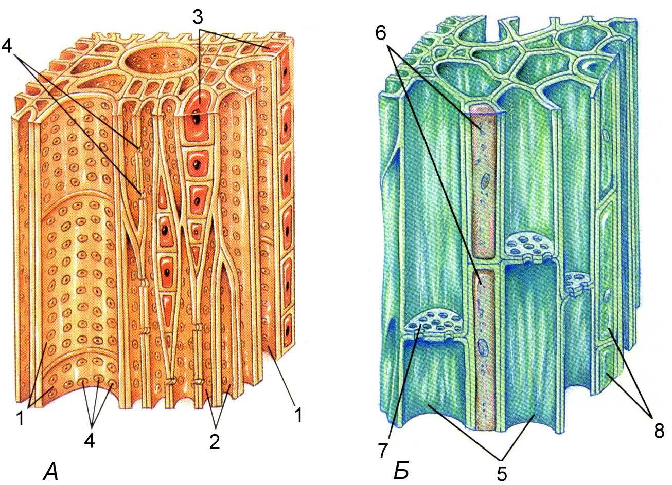 Рисунок: Проводящие ткани. А – ксилема; Б – флоэма. 1 – сосуды ксилемы; 2 – трахеиды; 3 – клетки древесной паренхимы; 4 – поры; 5 — ситовидные трубки; 6 – клетки – спутницы; 7 – ситовидные поля; 8 – клетки лубяной паренхимы.