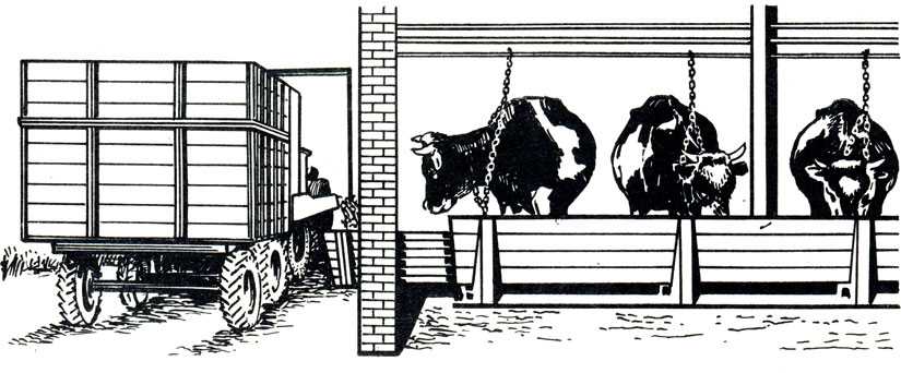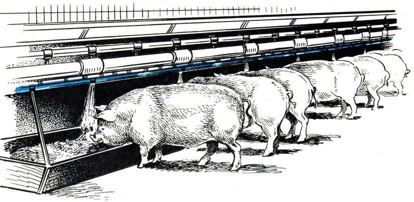На крупных свиноводческих комплексах животных кормят готовыми комбикормами, которые подают по трубопроводу в кормушки (рис. 107). Таким образом значительно облегчается процесс раздачи корма. Комбикорм можно разбавлять водой и подавать по трубам в жидком виде.