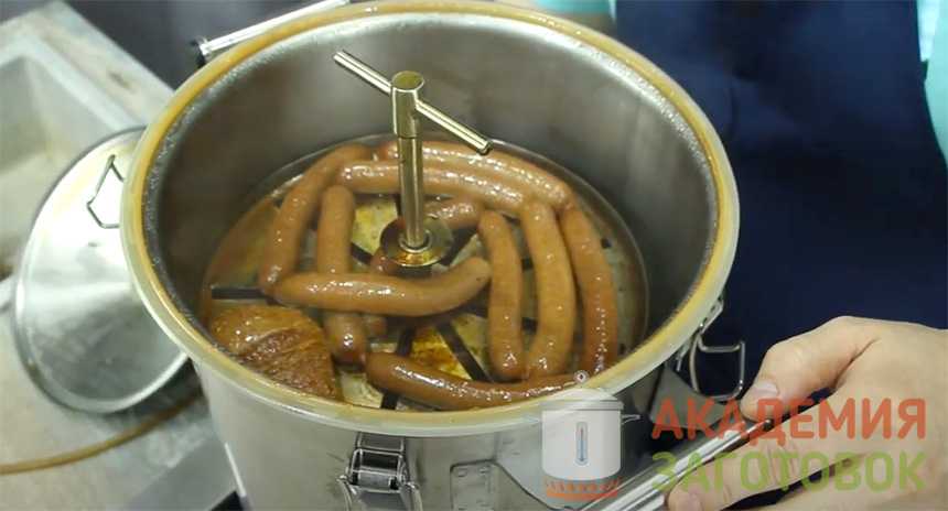 - далее колбасу опускают в горячую воду с температурой 65−70 градусов примерно на 15 минут и проваривают, постепенно поднимая жар до 80 градусов;