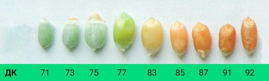 Созревание зерен охватывает период восковой спелости (от мягкой до твердой). В состоянии мягкой восковой спелости вмятина от ногтя выпрямляется, при поздней – уже нет. Листья и стебель желтые, стебли еще сохраняют гибкость.