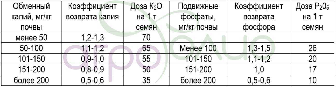 Дозы калийного и фосфорного удобрений под лен масличный рассчитывают в зависимости от содержания элементов минерального питания в почве (таблица 1). Перерасчет доз удобрений проведен на 1 т семян запланированного урожая с соответствующим количеством соломы.