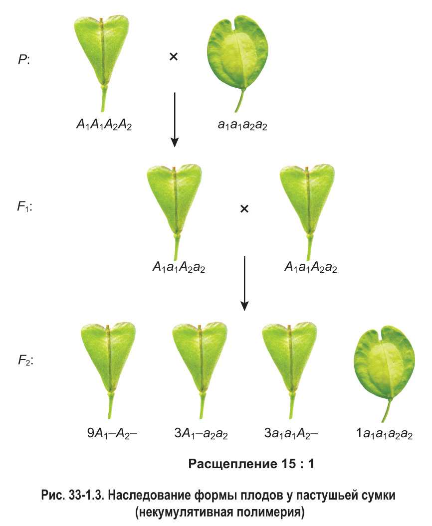 Скрещивание доминантной и рецессивной дигомозигот (рис. 33-1.3) приводит к появлению в первом поколении дигетерозиготных гибридов с треугольными плодами (А1а1А2а2). Во втором поколении наблюдается расщепление в соотношении 15 1.