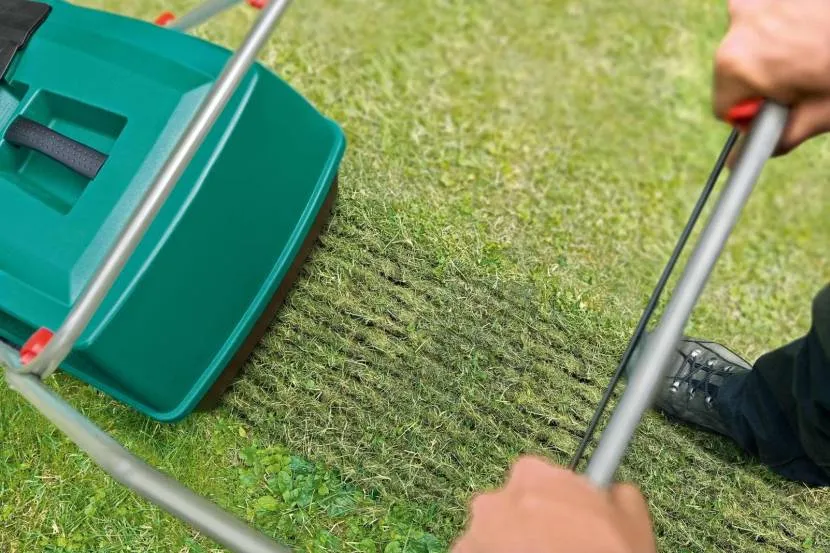 Бензиновый вертикуттер прореживает газон и одновременно удаляет мох (электрические вертикуттеры обладают меньшей мощностью).