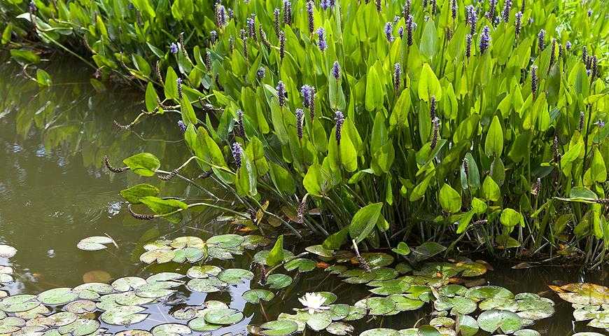 В прибрежной зоне чаще всего высаживаются дешампсия и аир, калужница и осока. Последняя в основном используется в крупных водоемах (осока торчащая). Отличным выбором будет и понтедерия сердцевидная, соцветия которой имеют необычный бледно-голубой оттенок и колосковидную форму.
