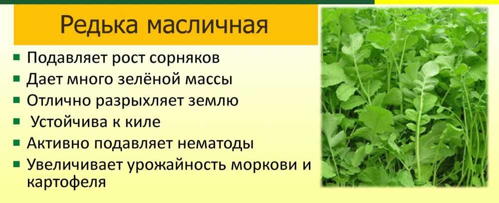Редька масличная слегка уступает другим крестоцветным по удобрительным качествам, но имеет такие преимущества: она хорошо приспособлена к любым климатическим условиям, быстро растёт в холодную погоду, засухоустойчива и подавляет нематоды.