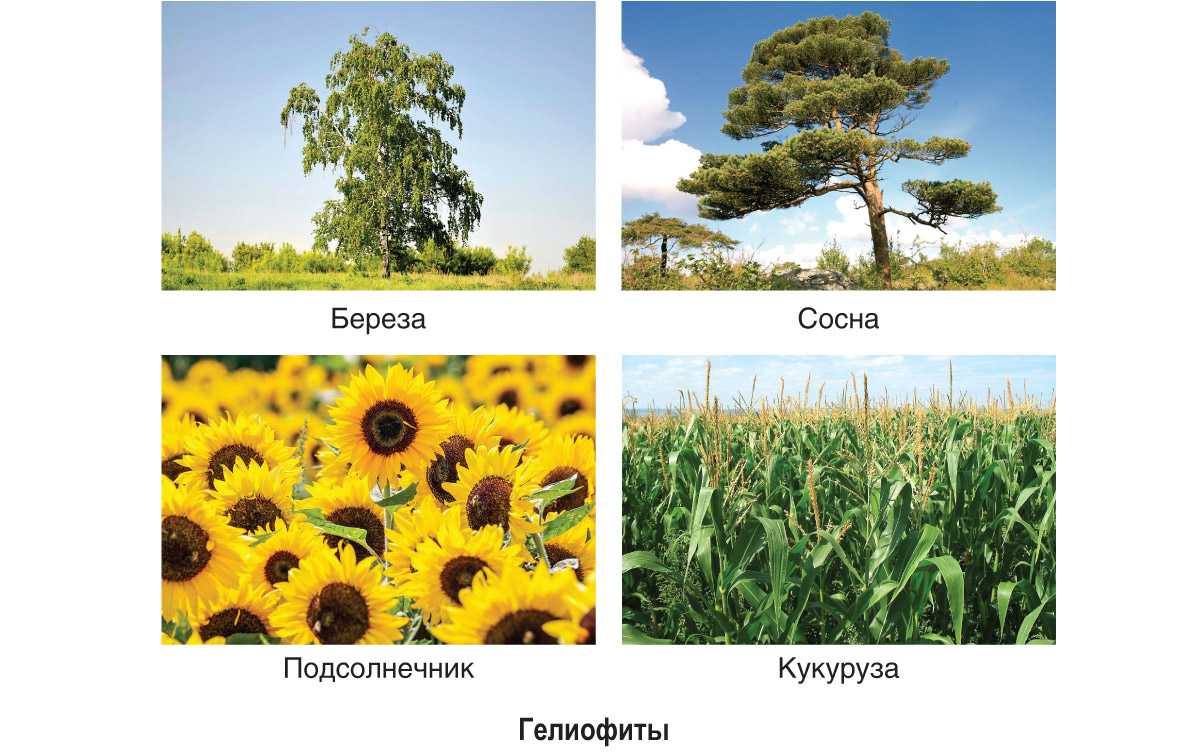 Гелиофиты обитают на открытых территориях, поглощают много солнечной энергии. Это растения пустынь, степей, высокогорных лугов, пустырей и обочин дорог (ковыль, мать-и-мачеха, очиток, молочай), сорняки и культурные растения (лебеда, подсолнечник, кукуруза, пшеница). Светолюбивые деревья образуют светлые леса, их кроны не смыкаются (лиственница, сосна, осина, береза).