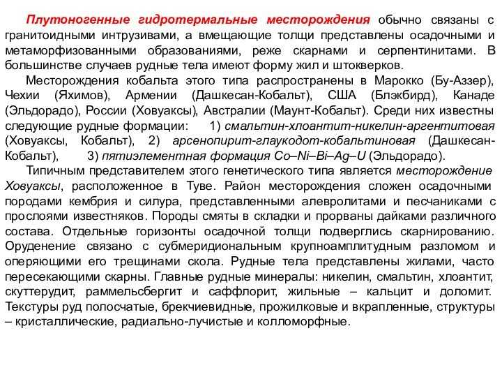 жил и штокверков.Месторождения кобальта этого типа распространены в Марокко (Бу-Аззер), Чехии (Яхимов), Армении (Дашкесан-Кобальт), США (Блэкбирд), Канаде (Эльдорадо), России (Ховуаксы), Австралии (Маунт-Кобальт). Среди них известны следующие рудные формации: 1) смальтин-хлоантит-никелин-аргентитовая (Ховуаксы, Кобальт), 2) арсенопирит-глаукодот-кобальтиновая (Дашкесан-Кобальт), 3) пятиэлементная формация Co–Ni–Bi–Ag–U (Эльдорадо).Типичным представителем этого генетического типа является месторождение Ховуаксы, расположенное в Туве. Район месторождения сложен осадочными породами кембрия и силура, представленными алевролитами и песчаниками с прослоями известняков. Породы смяты в складки и прорваны дайками различного состава. Отдельные горизонты осадочной толщи подверглись скарнированию. Оруденение связано с субмеридиональным крупноамплитудным разломом и оперяющими его трещинами скола. Рудные тела представлены жилами, часто пересекающими скарны. Главные рудные минералы: никелин, смальтин, хлоантит, скуттерудит, раммельсбергит и саффлорит, жильные – кальцит и доломит. Текстуры руд полосчатые, брекчиевидные, прожилковые и вкрапленные, структуры – кристаллические, радиально-лучистые и колломорфные.