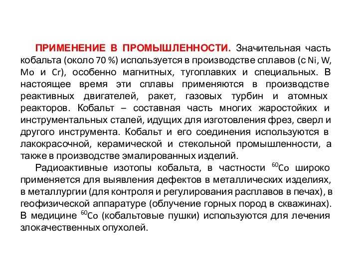 Слайд 4 ПРИМЕНЕНИЕ В ПРОМЫШЛЕННОСТИ. Значительная часть кобальта (около 70