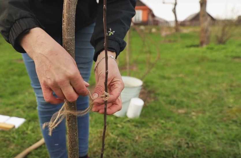 Для подвязки лучше всего использовать шпагат из натуральных материалов, широкую тесьму, полоску ткани, кембрик. Но только не полипропиленовый синтетический шпагат. На холоде он становится очень твердым, и ветер, раскачивая деревце, запросто прорезает им кору.