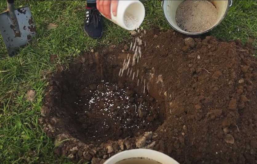 - Суперфосфат и золу или сульфат калия перемешиваем с почвой как на дне ямы, так и с той, которой будем засыпать корни.