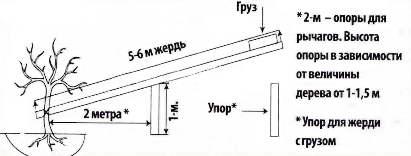 - на другой конец рычага прикрепить груз, вес которого следует приблизительно определить по соотношению к размеру дерева (ведро с камнями, мешок с кирпичами или песком и т. п.);