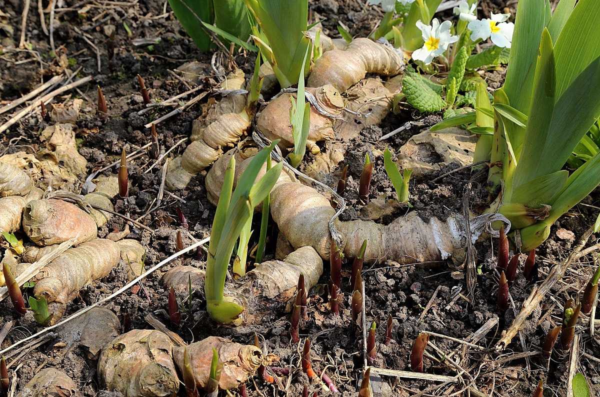 Некоторые растения с корневищами требуют дополнительного ухода, другие — нет. Корневища ириса бородатого, например, нельзя полностью засыпать землей. Корневища ирисов также являются особенными в том смысле, что корневище, дающее ростовые почки для нового ириса, не будет повторно цвести. Его следует удалить, чтобы освободить место для новых побегов, так как ирисы не любят перенаселенности и не зацветут, если их будет слишком много. Делим корневища ириса когда они становятся слишком плотными.