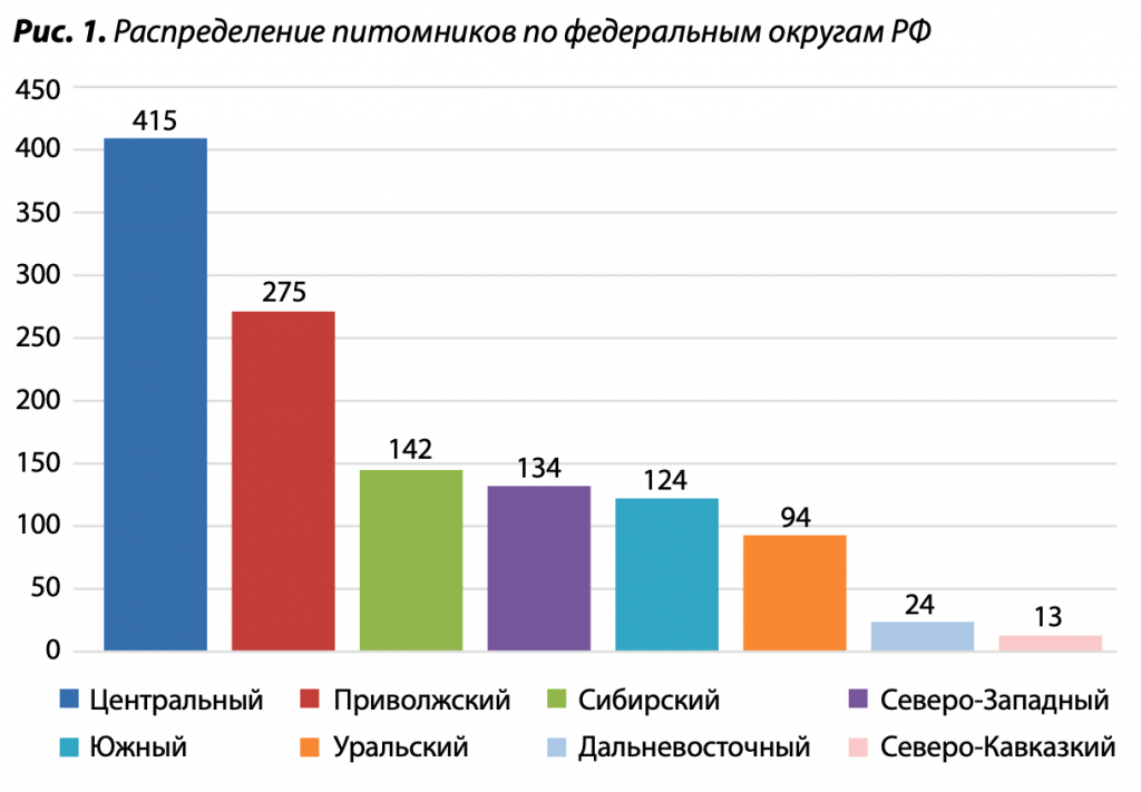 Анализ информационных материалов показал, что среди экспертов и ученых мнения о необходимом количестве питомников для обеспечения подотрасли садоводства несколько различаются. Так, по оценке Х. В. Шарафутдинова, профессора ФГБОУ ВО «Российский государственный аграрный университет — МСХА им. К. А. Тимирязева», данной на основе изучения рынка, для удовлетворения внутренних потребностей во всех видах саженцев нужно иметь 2200 питомников общей площадью около 62 тыс. га. В 2017–2020 годах для закладки новых плодово-ягодных садов без учета запросов любительского садоводства требовалось дополнительного посадочного материала почти на 20 млрд рублей. По расчетам специалиста, если весь объем рынка саженцев оценивается в 135 млрд рублей, то 108 млрд рублей из них, уходящие за рубеж, в перспективе могут остаться в нашей стране.