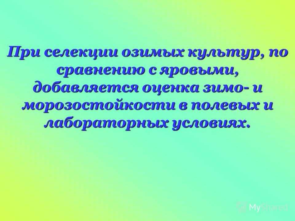 При селекции озимых культур, по сравнению с яровыми, добавляется оценка зимо- и морозостойкости в полевых и лабораторных условиях.