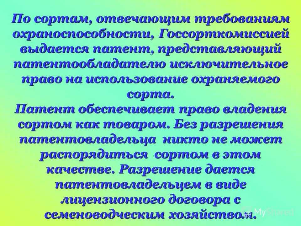 По сортам, отвечающим требованиям охраноспособности, Госсорткомиссией выдается патент, представляющий патентообладателю исключительное право на использование охраняемого сорта. Патент обеспечивает право владения сортом как товаром. Без разрешения патентовладельца никто не может распорядиться сортом в этом качестве. Разрешение дается патентовладельцем в виде лицензионного договора с семеноводческим хозяйством.