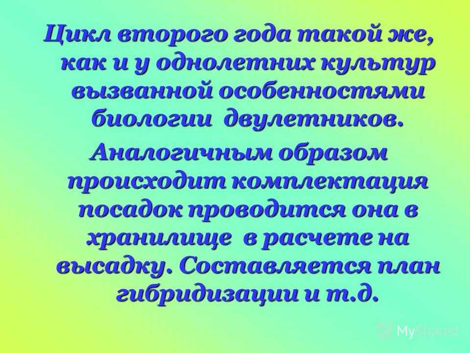 Цикл второго года такой же, как и у однолетних культур вызванной особенностями биологии двулетников. Аналогичным образом происходит комплектация посадок проводится она в хранилище в расчете на высадку. Составляется план гибридизации и т.д.