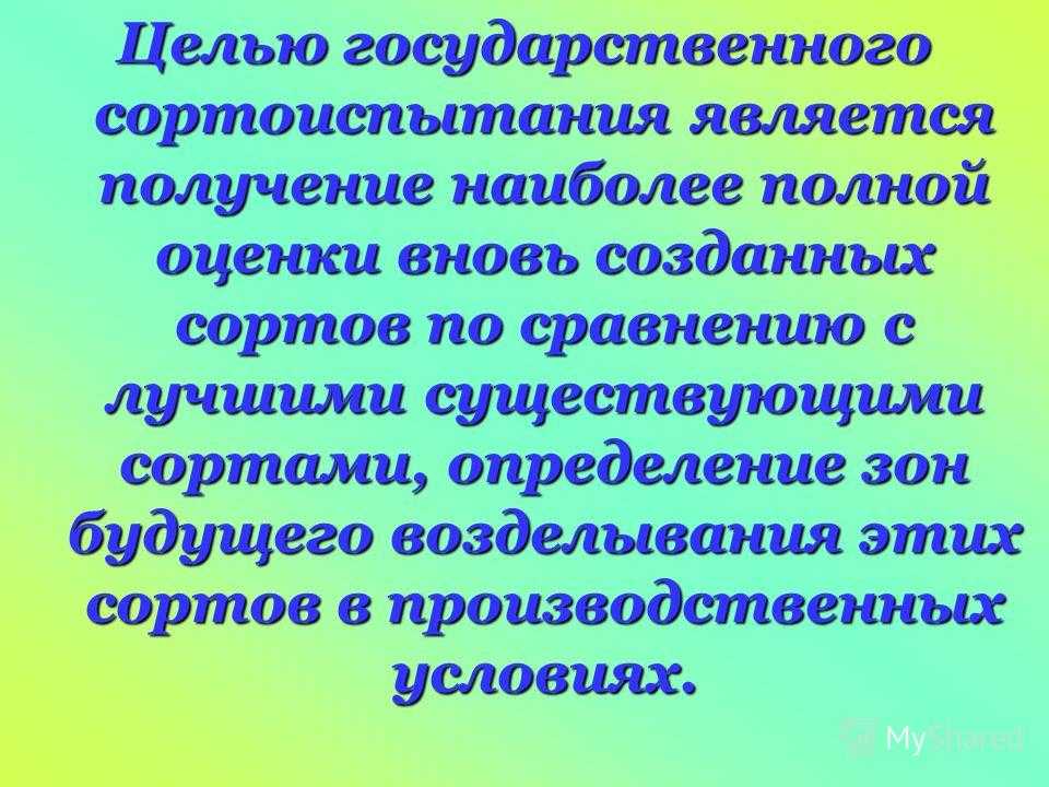 Целью государственного сортоиспытания является получение наиболее полной оценки вновь созданных сортов по сравнению с лучшими существующими сортами, определение зон будущего возделывания этих сортов в производственных условиях.