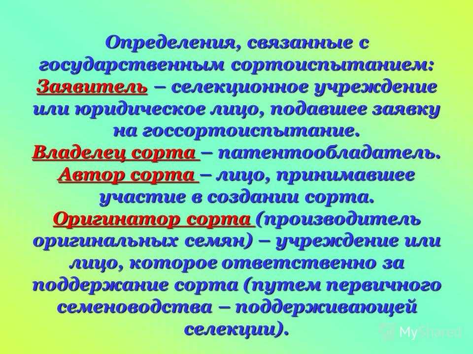 Определения, связанные с государственным сортоиспытанием: Заявитель – селекционное учреждение или юридическое лицо, подавшее заявку на госсортоиспытание. Владелец сорта – патентообладатель. Автор сорта – лицо, принимавшее участие в создании сорта. Оригинатор сорта (производитель оригинальных семян) – учреждение или лицо, которое ответственно за поддержание сорта (путем первичного семеноводства – поддерживающей селекции).