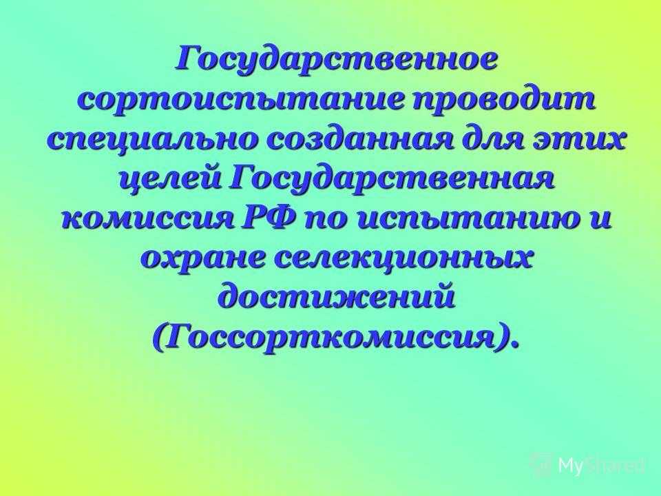 Государственное сортоиспытание проводит специально созданная для этих целей Государственная комиссия РФ по испытанию и охране селекционных достижений (Госсорткомиссия).