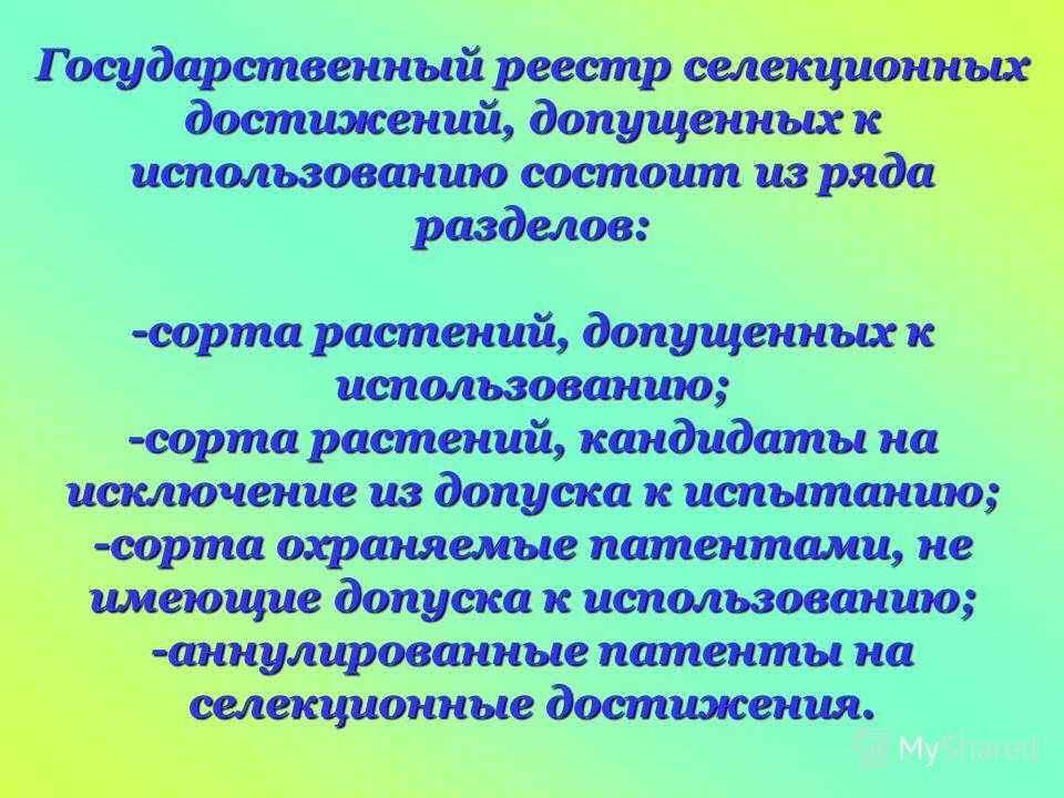Государственный реестр селекционных достижений, допущенных к использованию состоит из ряда разделов: -сорта растений, допущенных к использованию; -сорта растений, кандидаты на исключение из допуска к испытанию; -сорта охраняемые патентами, не имеющие допуска к использованию; -аннулированные патенты на селекционные достижения.