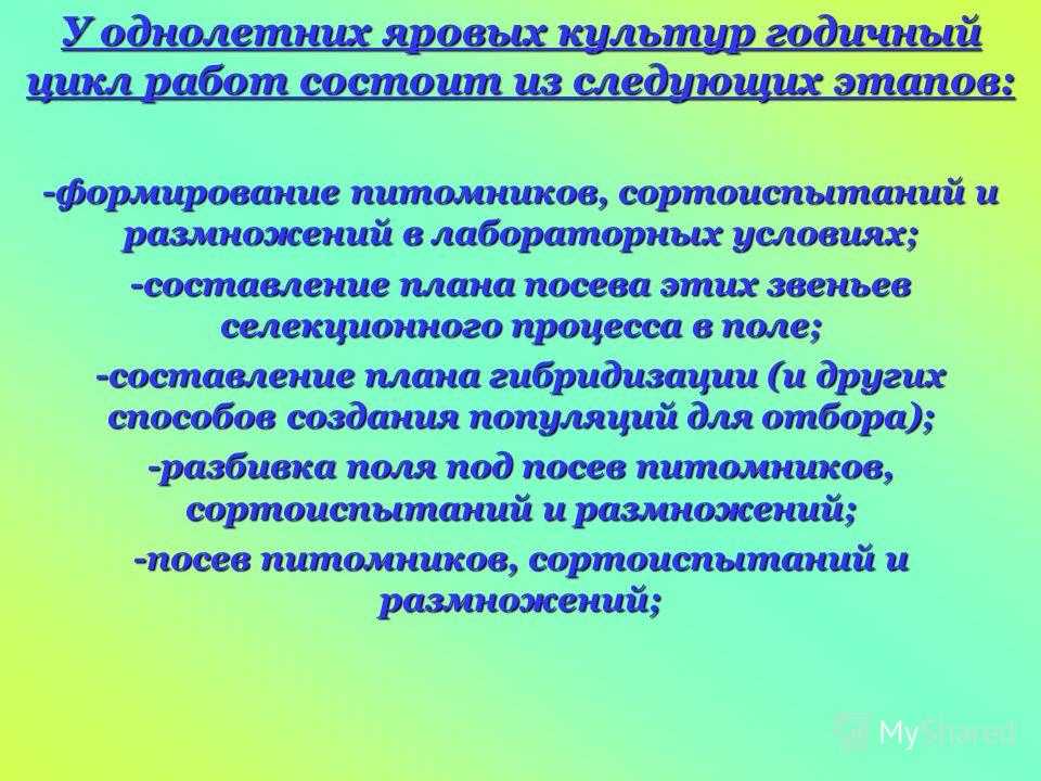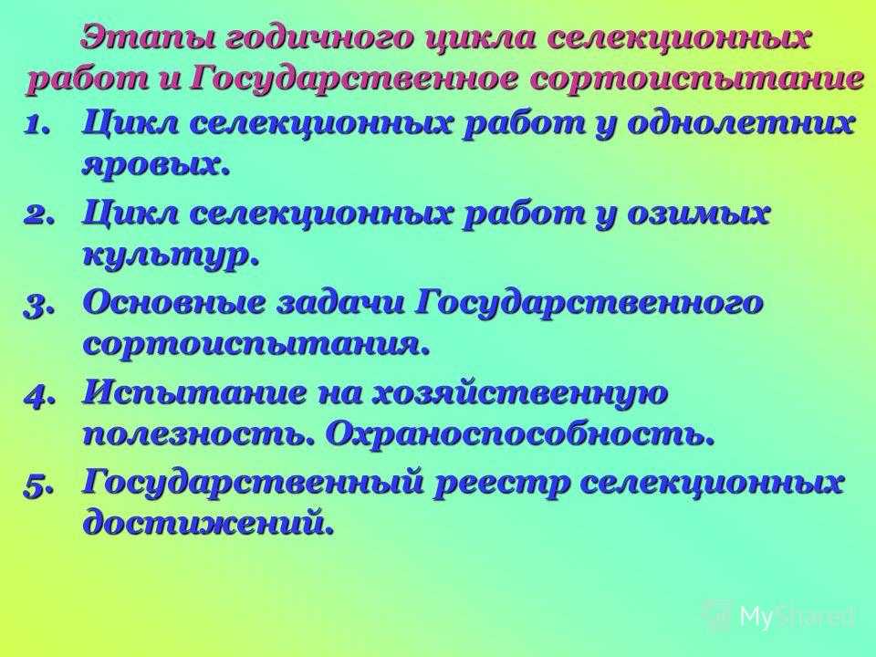 Презентация на тему: » Этапы годичного цикла селекционных работ и Государственное сортоиспытание 1.Цикл селекционных работ у однолетних яровых. 2.Цикл селекционных работ у озимых.» — Транскрипт: